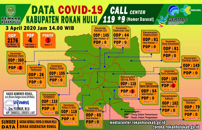 "Adapun ODP sampai dengan (3/4/2020), berjumlah 2.176, dengan rincian, 1.873 dalam pantauan, 303 bebas atau tidak d pantau lagi (aman) sehingga secara kumulatif ODP Rohul mengalami perubahan, yaitu pada